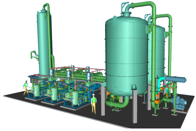As standard, the vacuum system consists of rotary vane vacuum pumps, which have the lowest energy consumption among vacuum pumps, equal to the screw vacuum pumps. Upstream the vacuum pump, Roots blowers are installed as boosters to the vacuum pumps. Roots blowers are characterized by being able to transport large vapour volumes, over a relatively modest pressure range, highly energy-efficient. In the DTL VRUs, roots blowers evacuate VOC vapour from the activated carbon, in the pressure range 10 to 20 kPaA. At 20 kPaA, the VOC vapour volume is compressed to approximately the half of the volume it makes out at 10 kPaA. This requires a vacuum pump with only the half vapour capacity operating from 20 kPaA, in comparison to if it operates from 10 kPaA.